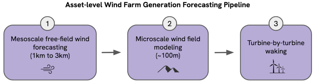In fact, we find that wind energy modeling best practices dictate separating this problem into three stages: 1) the mesoscale free-field wind2 forecast, 2) the microscale wind field within the wind farm footprint (less than 1km effects usually influenced by terrain), and 3) turbine-by-turbine waking (Figure 1).