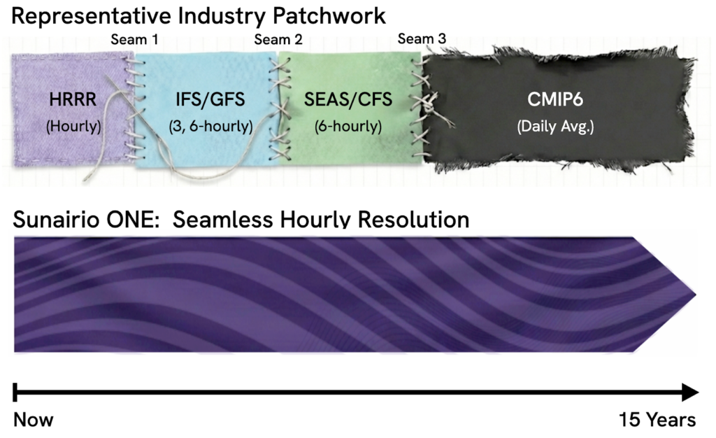 Figure 2. The standard industry approach involves stitching together different models with varying resolutions, creating data "seams" and leaving a massive void for long-term planning. Sunairio ONE provides a seamless long-term outlook.