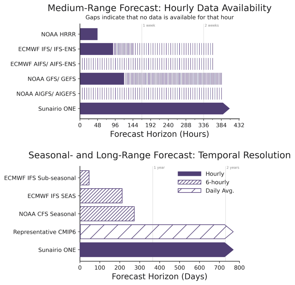 Figure 1. (Top panel) Even within a short 16-day outlook, alternative forecasts provide sparse data with low temporal resolution across days while Sunairio ONE provides dense hourly data without gaps; (Bottom panel) For seasonal or longer outlook periods, only Sunairio ONE provides hourly data.